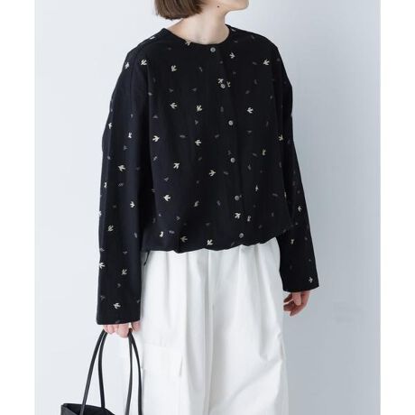 シンプルなボトムを合わせるだけでスタイリングが決まる一品。愛らしい刺繍生地が存在感を高めるブラウスが届きました。クルーネックの前開き仕様はトップスとしてはもちろん、ボタンを開けてカーディガンとしても着用が可能。後ヨーク下にほんのりとギャザーが施されたデザインです。裾には紐が通してあり絞り具合でシルエットが変化。お好みのボリューム感をお楽しみいただけます。パンツとスカートもご用意しているのでぜひご覧ください。