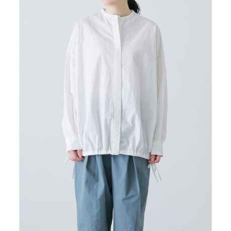 スタイリング次第で様々な着こなしに対応できるアイテム。トップスとしてはもちろん、ボタンを開けてカーディガンとしても着用が可能です。コンパクトなクルーネックがどこか上品な佇まい。生地はロングシーズン重宝するコットン100%を使用しています。裾には共生地の紐が通してありブラウジングができる仕様。そのままサラッとストレートに、絞ってふくらみを持たせたり、様々な表情をお楽しみいただける一品。