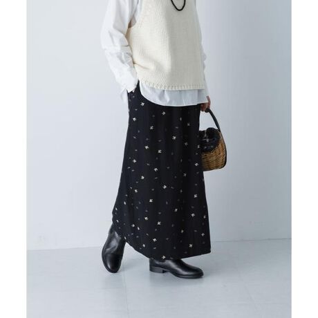 ストレートのラインが上品なデザインに愛らしい刺繍生地を掛け合わせました。ラップ部分は内側も脇でしっかりと縫われているので、脚が見えてしまうことはありません。足さばきが楽にできるほんのりとした台形のシルエットは見た目以上に歩きやすいです。ウエストはゴムが入っているリラクシーな仕立て。トップスとパンツもご用意しているのでぜひご覧ください。