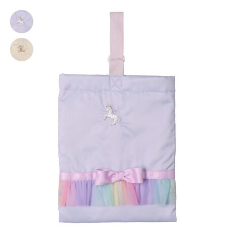 入園・入学準備品!学校、習い事、おけいこ事にも!手提げデザインのシューズケース、シューズバック、シューズバッグ、靴入れ。チュールフリルとリボンもポイント!ラベンダーはユニコーン、ベージュはくまの刺繍入り。内側はユニコーンの総柄、くまの総柄。内側にはお名前を書ける欄も付いています!同じ柄で通園バッグ(B27621)、巾着(B27637、B27625)、ランチョンマット(B27830)、エプロン(B27829)、レッスンバッグ(B27620)、ナップザック(B27622)があるので、入園、入学準備で色々なアイテムを同じ柄に揃えることも出来ます。【アイテム】 雑貨 カジュアル お洒落 オシャレ かわいい 可愛い 普段着 デイリーウェア お出かけ 子ども こども 女児 女の子 ガールズ キッズ ベビーサイズ トドラーサイズ 幼稚園 保育園 小学校 通園 通学 小学生 遠足 旅行 2026年春夏物新作 丸高衣料 小物 手提げ袋 サブバッグ シューズバッグ 靴入れ 靴袋 パープル ラベンダー 薄紫色 入園入学準備品 キッズフォーレ クマ アニマル 動物