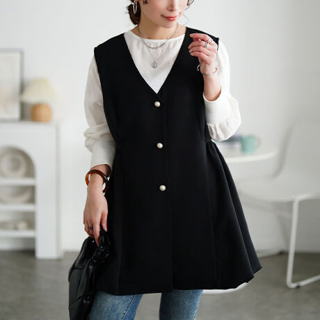 マニッシュライクなジレジャケットを、女性らしいシルエットに落とし込んだデザインが魅力の一着。シンプルながらも、拘りを感じさせるシルエットは、ワンツーコーデに重ねるだけで格上げさせてくれる大人の綺麗めアイテム。シックな黒はどんなスタイリングもキリッと引き締めてくれます。高めの切り替えギャザーが脚長効果を促し、裾広がりのペプラムシルエットでメリハリのあるシルエットを生み出し、バルーン裾でボリューム感アップ。安心の丈感で、気になるヒップや太ももまわりもしっかりカバー。広めのアームホールだから厚手のインナーでも窮屈感を感じません。