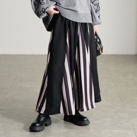ストライプ柄の切り替えデザインが、縦のラインを強調し、すっきりとした印象に仕上げるフレアスカート。体型を拾いにくいフレアシルエットで、自然にきれいなラインを演出します。