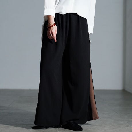 落ち着きのある配色ラインがサイドにデザインされたワイドシルエットのパンツは、コーデに取り入れるだけでトレンド感を演出するアイテム。ジャージライクな程よい光沢感を生み、カジュアルながらも高見え感をプラス。スカート見えする裾広がりなシルエットで華やかに。サイドラインと、フルレングス丈で一層縦ラインを強調し、たっぷりのワイドシルエットながら、すっきりとした印象に。ウエストは全ゴム仕様だから、ストレスフリーな穿き心地で安心。落ち感のあるフレアシルエットで下半身を丸ごと体型カバーする頼れる一本。