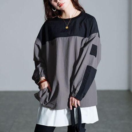 洒落る大人バイカラー☆撥水裾ドロストナイロンプルオーバー体型を拾わないゆったり身幅&袖幅でリラクシーな着用感◎お尻がしっかり隠れる長めの着丈で気になるヒップ&腰まわりをカバー♪裾ドロストで簡単にシルエットチェンジができるのでボトムに合わせて楽しめます☆洒落感高まるアシメ袖切り替えや、胸元カラビナがカジュアルな雰囲気の中にモード感を漂わせる唯一無二の一着です!