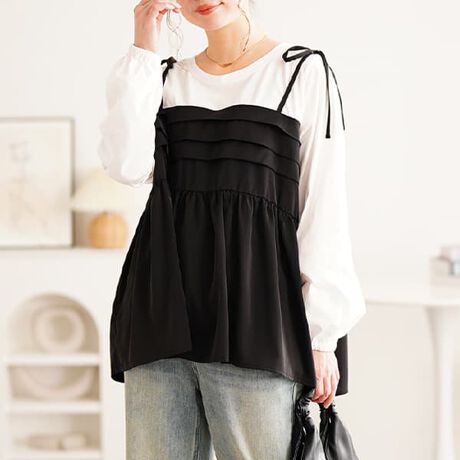 ロンTとビスチェを重ねたような、1枚で着映えるドッキングデザイン。胸下切り替えからふんわり広がるシルエットが、自然に体形をカバーしてくれます。着るだけでコーデが完成するので、忙しい日にも頼れる1枚です。