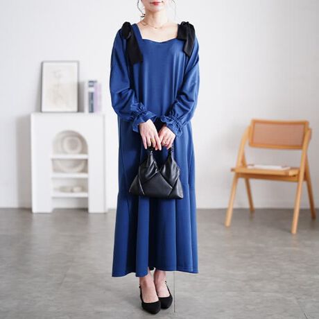 両肩にあしらったリボンとカッティングが、ヘルシーな肌見せを叶えるワンピース。首元はスクエアネックですっきりとした印象に仕上げ、甘さの中にも大人っぽさをプラスしました。ふわりと柔らかい肌触りの生地で、春・秋・冬とロングシーズン活躍します。
