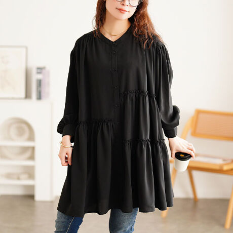 アシンメトリーな切り替えギャザーデザインが魅力的なシャツチュニックは、非対称のギャザーがシンプルなチュニックにリズムをプラスし、さり気ない個性を放つ一着。程よく艶感のある生地が高見え効果を発揮し、綺麗めにも、可愛くも、モードスタイルにも馴染む、欲張りなデザイン。随所にギャザーがあしらわれたデザインで、見た目以上のゆったり感。裾に向かって広がるフレアシルエットと、安心のチュニック丈でお腹周りや、ヒップ、太ももを包み込み、体型を拾わないから着るだけで体型カバー&華奢見えに。ボリューム袖で愛らしく二の腕もカバーしてくれます。