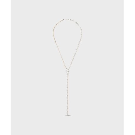 ゴールドとシルバーのバイカラーのロングネックレス。3種類のチェーンを組み合わせ、1連でも2連でも、Y字シルエットのラリエットとしても使えるデザイン。