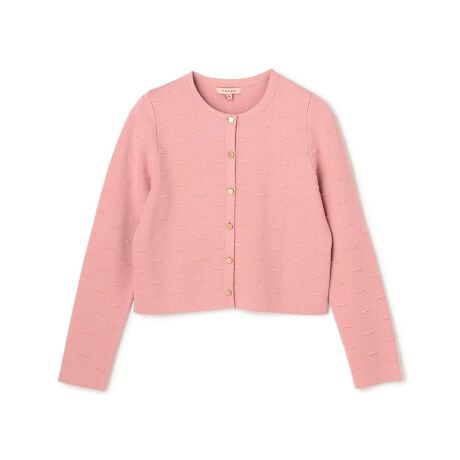 全体にリボンモチーフを散りばめた、遊び心のあるデザインが目を引くカーディガン。シンプルなラウンドネックにゴールドのフロントボタンを合わせることで、クラシカルな雰囲気を漂わせています。