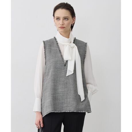 ■デザイン深めのV開きが上半身をすっきり見せてくれるツイードジレです。上品なフリンジディテールが華やかさをプラス。両サイドに深めのスリットを入れ、セットアップ着用時にポケットに手が入りやすい仕様になっているのもこだわりです。後ろ身頃にはコンシールファスナー付きなので脱ぎ着しやすいのも嬉しいポイントです。カラーは爽やかなライトデニムミックス(972)ブラック×オフホワイトミックス(905)の2色展開です。