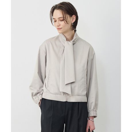 ■デザイン取り外し可能なボウタイ付きのブルゾンジャケット。ボウタイを外すと、ノーカラーブルゾンとしても着用いただけます。ボリュームのある袖コンシャスなデザインで、メンズっぽくなりがちなブルゾンをエレガントに表現しました。総裏仕立てですが、軽い着心地なのもポイントです。カジュアルにももちろん、きれいめにも羽織れる万能な一枚です。