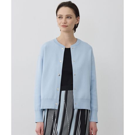 ■デザイン様々なスタイルに気兼ねなく羽織れるニットカーディガン。ニットならではのコンパクトな目面と程よいツヤの表面感が、カジュアルすぎず高級感ある印象です。衿はブルゾンタイプで、釦はメタルのスナップ釦を施し、辛口なアクセントをプラスしました。春や秋など、気温が不安定な時期にあると便利な、アウターとしても活躍する一枚です。