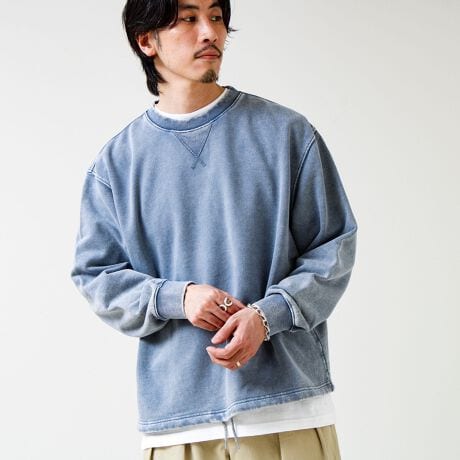 TC裏毛スノーパウダー素材を使用し、表面に粉をふいたようなフェード感のある仕上がり。新品なのに着古したようなヴィンテージライクな表情が魅力です。