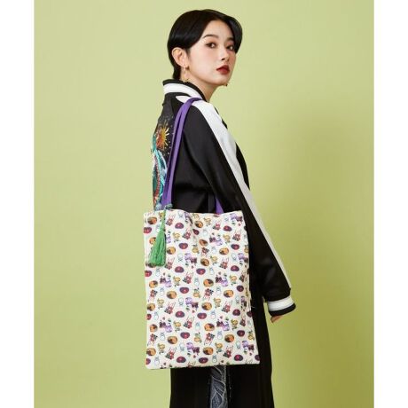 [型番:7IKP6101-2026]【倭物やカヤ×鈴木ひょっとこ】伝統×現代の融合を魅力的に描く、画家・鈴木ひょっとことのコラボ商品。鮮やかな色彩と独特な世界観が際立つトートバッグ。肩掛けにも便利な長めの持ち手仕様で日常使いはもちろん、アートをまとう感覚でコーデのアクセントにもおすすめ。