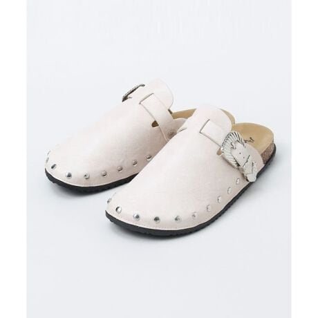 丸型スタッズがアクセントになったサンダル。程よいツヤ感のある合皮素材がヴィンテージな雰囲気を演出。メンズライクなシルエットで、季節問わず履き回せる万能アイテム。