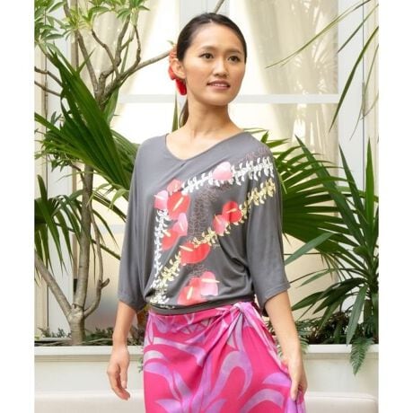 アンスリウムとケニケニを組み合わせた印象的なレイ柄が目を惹くドルマンスリーブトップス。前後2way仕様で着回しが効き、首元はすっきりとしたVネック風の開きが上品な印象に。落ち感のある柔らかなレーヨン素材が女性らしいシルエットを演出。二の腕をカバーするゆったり袖で着心地も快適。リラックス感と華やかさを兼ね備えた一枚です。