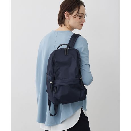 【仕様】・内ポケット:フラット1、メッシュフラット1、メッシュファスナー1、PC用1・外ポケット:ファスナー4(背中部分のポケットは左右にファスナーがついています)・撥水(ファスナー部分は除く)・横ポケット(ファスナーを開けた状態でペットボトルや折り畳み傘を入れることが出来ます)