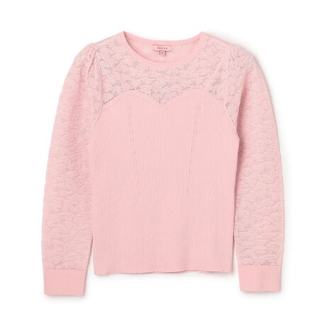 ハート柄のレースをあしらったシアーなデザインが目を引くニットトップス。