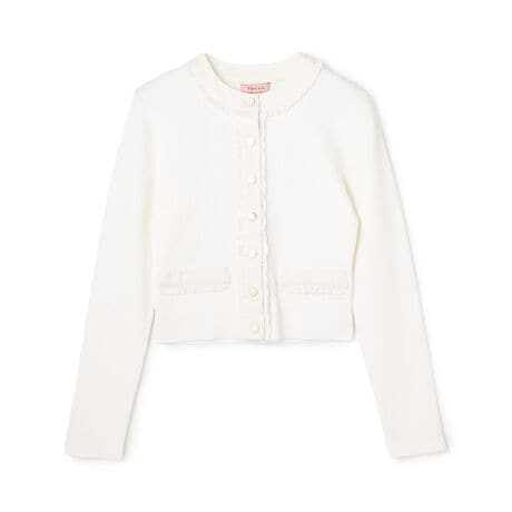 コンパクトなシルエットに、デニム素材のフリルをあしらったデザインカーディガン。