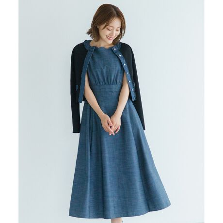シンプルながらも洗練されたデザインが魅力のドレス。ネックラインにはさりげないスカラップカットが施され、上品な甘さをプラス。ウエスト部分にはタックと切り替えデザインが入り、スタイルを美しく引き立ててくれます。スカートは程よく広がるフレアシルエットで、動くたびに優雅な揺れ感を演出。フォーマルなシーンから特別な日の装いまで、幅広く活躍できるエレガントな一着。