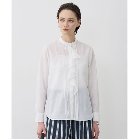 ■デザインフロントの繊細なタックとラッフルデザインが着映えを叶えるブラウスです。胸元のラッフルは取り外しが可能で、気分やシーンに合わせて違った表情を楽しめます。ラッフルを付ければ、ジャケットやアウターを羽織った際も華やかなアクセントに。ラッフルを外して、タックと襟元のディテールを活かしたレイヤードスタイリングもおすすめです。お仕事着としてももちろん、華やかなシーンにも活躍する万能な一枚です。