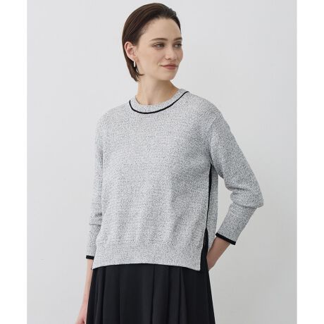 ■デザインミックス感のある素材がユニークな表情のクルーネックニットです。衿ぐり、袖口、脇に配色ラインを入れ、きりっとしたアクセントを効かせました。サイドにはスリットを入れることでこなれ感もプラス。一枚着としてはもちろん、アウターのインナーとして着用した際もコーディネートに華やかさをプラスしてくれるアイテムです。