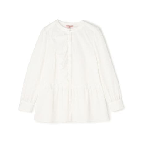 ウエストのギャザーが自然にシルエットを引き締め、メリハリのある着こなしを叶えるのも魅力。丸みのある首元と、ボタンを隠したデザインが甘さを程よく抑え、上品な印象に仕上げています。柔らかな素材感と淡い色合いが女性らしさを引き立て、デイリーから特別なシーンまで活躍する一着。