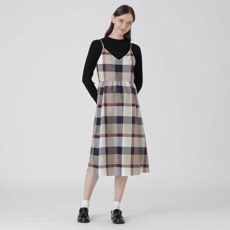 [型番:55J05710__]◆ふんわりシルエットのキャミソールドレス【Design】華やかなクレストブリッジチェック生地を使用したキャミソールドレスです。シルエットにこだわり、身頃上部分には程よいフィット感を出す為にカッティングを入れ、スカート部分にはふんわりとしたシルエットを出す為にタックを入れました。インナー次第でシーズンレスに活躍するアイテムです。