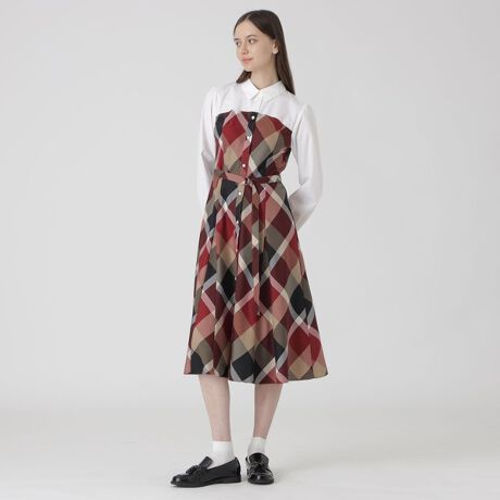 [型番:55J04710__]◆クレストブリッジチェックが華やかなコンビシャツドレス【Design】シャツ襟デザインの、柔らかなフィット&フレアーシルエットが美しいドレスです。ビスチェデザインがブルーレーベルらしいポイントです。切り替えラインから裾に向かって入れたマチが綺麗なシルエットを演出します。ウエスト後ろにはゴムが入っているので、快適な着用感です。ウエストベルトは取り外し可能です。