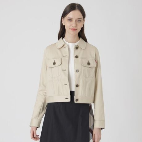 [型番:55F04717__]◆ショート丈デニムジャケット【Design】コンパクトなシルエットが今年らしいGジャンです。本格的な見た目のデニムライク素材を使用しました。ショート丈デザインなのでウエスト位置が高く見え、スタイルアップが叶います。胸元ポケット部分についたピスネームがアクセントになっています。季節の変わり目のスタイリングに活躍する、便利なアイテムです。