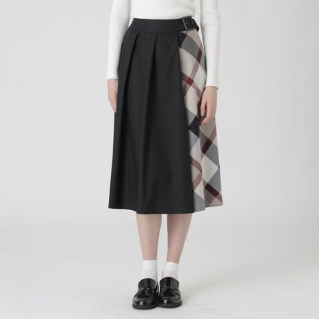 [型番:55S02705__]◆パーシャル使いしたクレストブリッジチェックがポイントのスカート【Design】ブリティッシュでトラディショナルな巻きスカートからインスピレーションをうけたスカートです。フロント部分の大きなハンドプリーツとサイドに配したクレストブリッジチェックがポイントです。後ろウエストはゴム仕様になっているので、快適な着用感です。