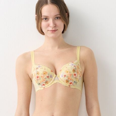 夏の太陽にむかって花々が咲き誇り茂るように 、カップ下側からカップ上側に向かってプリントを使用しました。花束のように華やかに胸元を飾るデザインです。プリントの柄に使用されている花は、リンゴの花、 ネモフィラ、ペチュニアなどの春夏の花々です。