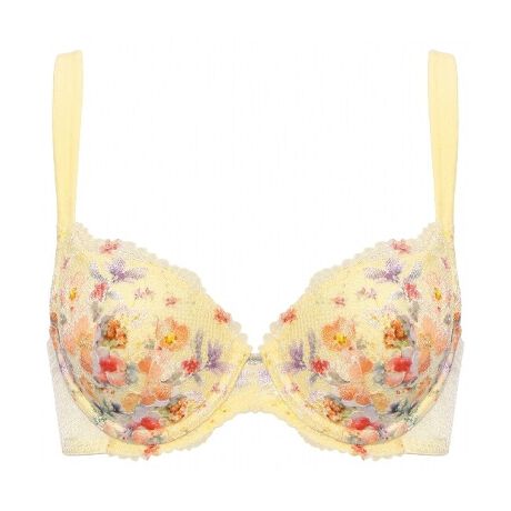 夏の太陽にむかって花々が咲き誇り茂るように 、カップ下側からカップ上側に向かってプリントを使用しました。花束のように華やかに胸元を飾るデザインです。プリントの柄に使用されている花は、リンゴの花、 ネモフィラ、ペチュニアなどの春夏の花々です。