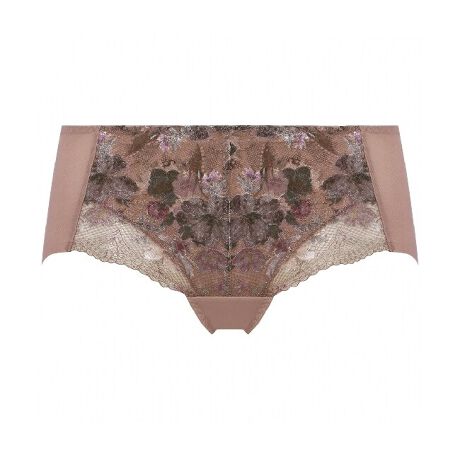はきこみは浅く、脚口はフロントがレース、後ろは一枚仕立て、ヒップハンガータイプのショーツです。