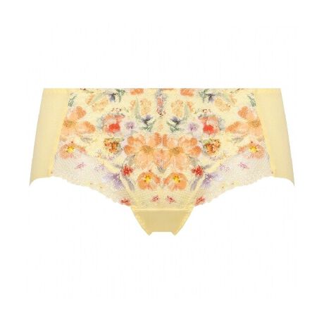はきこみは浅く、脚口はフロントがレース、後ろは一枚仕立て、ヒップハンガータイプのショーツです。