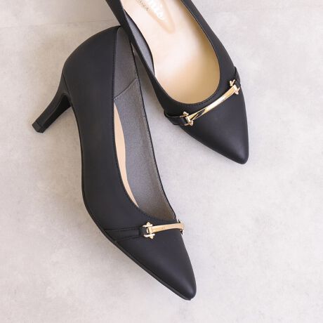 ・マットな質感のアッパーと、ゴールドのビットとバーの組み合わせが上品なパンプス。