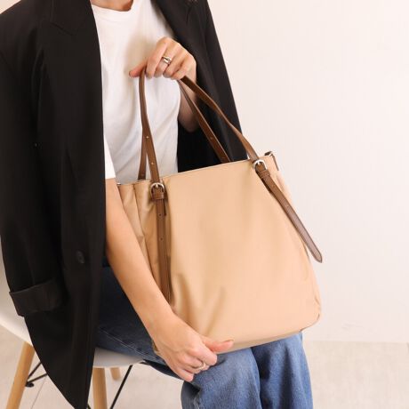 ・持ち手を合成皮革にすることで大人カジュアルな雰囲気に。