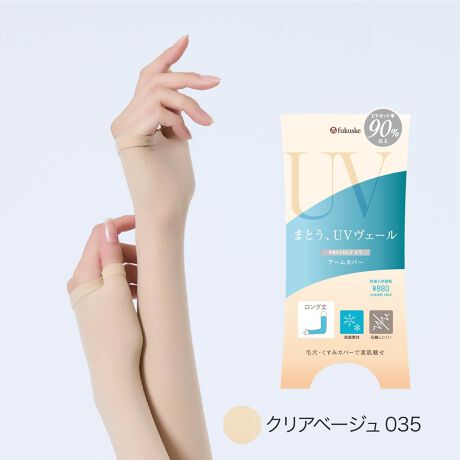 毎日の紫外線対策を、もっと手軽に。365日、絶え間なく降り注ぐ紫外線、日々忙しく過ごす中でも、紫外線対策をしたい。そんなあなたの生活に寄り添いながら、手間をかけずに肌を守る新感覚のUVケアブランドが誕生。「まとう、UVヴェール」東レ(株)の「クリアヴェール」を使用。高透明・高発色ながらも紫外線遮蔽率が高いストッキングのような極薄生地でUV遮蔽率90%以上を実現。肌に密着することで、自然な見た目でファンデーションのように気になる毛穴・キズ・くすみをカバーしてくれます。ロング丈なので二の腕までしっかり対策できます。涼感素材と遮熱機能で暑さと強い日差しの季節にピッタリです。親指穴付きでズレにくく、抗菌防臭加工でエチケット対策にもおすすめ。