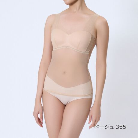 「素肌を直接魅せるのは恥ずかしい!」「美肌に見せたい」というお悩みに応え、着用する事でお肌をキレイにカバーし、まるでレタッチ効果のように見せてくれる、美カップ付きタンクトップです。肌馴染みの良いスキントーンで、インナーに悩みがちな肌魅せコーデにピッタリの一枚です。最大の特長は、軽い付け心地でありながら、美カップ付きで胸すっきりキレイ魅せと、バストをキレイに支える欲張り設計を両立させている点です。カップは脇高設計のため、就寝時や動いている時もバストが横流れしにくい構造です。さらに、カップ下にはしっかりアンダーメッシュテープを配し、安定してバストを支えます。また、カップの前中心が繋がっている設計でバストトップが広がりにくく、パワーネットパーツがバストを優しく持ち上げ、美胸に整えます。脇部分には2重パネルを配し、胸脇をスッキリと押さえて脇肉が広がりにくい設計です。このように多機能でありながら、胸部がシームレスな設計のため、薄手のトップスやぴったりしたアウターを着用してもラインが響きにくいのも魅力です。素肌をキレイにカバーしつつ、バストラインも整える、まさに理想的なインナーウェアです。