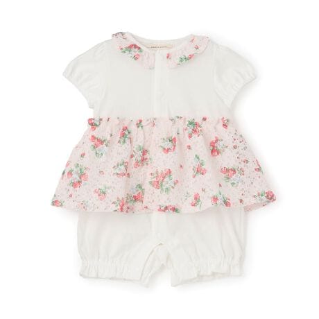 衿のフリルとスカートデザインが目を引くショート丈のカバーオールです。