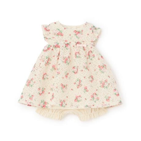 野イチゴ柄のレース生地を使用したベビースーツです。ブルマのウエストと裾口は動きやすい総ゴム仕様。ワンピースは後ろあきの設計になっており、着脱もラクラクです。ノースリーブなのでインナーを変えることで長く着用でき、さまざまなコーデが楽しめます。【おすすめの着用時期は春夏シーズン】