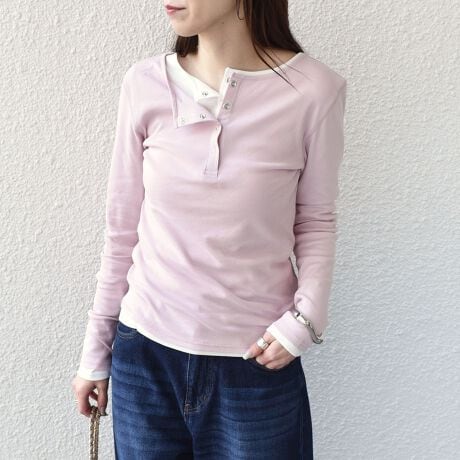 大きく開いたネックからインナーを覗かせるレイヤードスタイルは今季らしいトレンド感がでておすすめ。