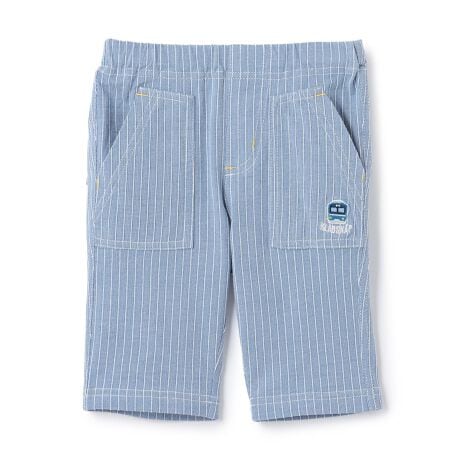 電車の刺しゅうがワンポイントで可愛い6分丈パンツです。きれいめなスタイルにもカジュアルにもマッチする、さわやかなストライプ柄。ヒッコリー風のカットソー素材でやさしい肌当たりを実現しました。ウエストゴム仕様なので脱ぎはきも簡単です。内側にお名前を記入できるタグつき。【おすすめの着用時期は春夏シーズン】