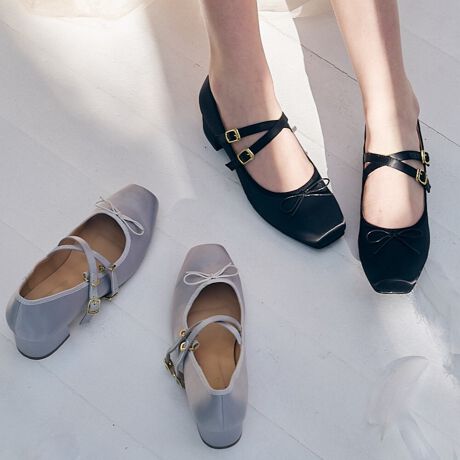 バレエシューズからインスパイアされた、柔らかなカーブのスクエアトゥが上品なサテンシューズ。