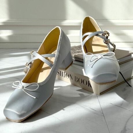 バレエシューズからインスパイアされた、柔らかなカーブのスクエアトゥが上品なサテンシューズ。