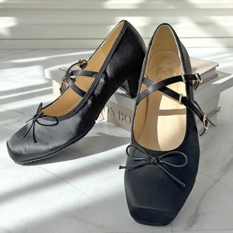 バレエシューズからインスパイアされた、柔らかなカーブのスクエアトゥが上品なサテンシューズ。