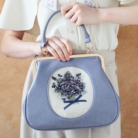 カメオのようなオーバーフレームに繊細なスミレの刺繍を施したハンドバッグ。