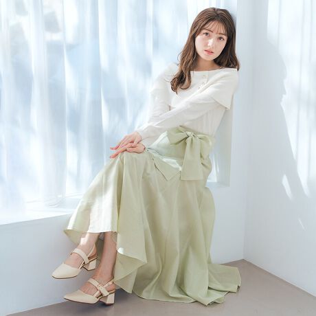 シアーなボイル素材と、やわらかなカラーが印象的なロングスカート。