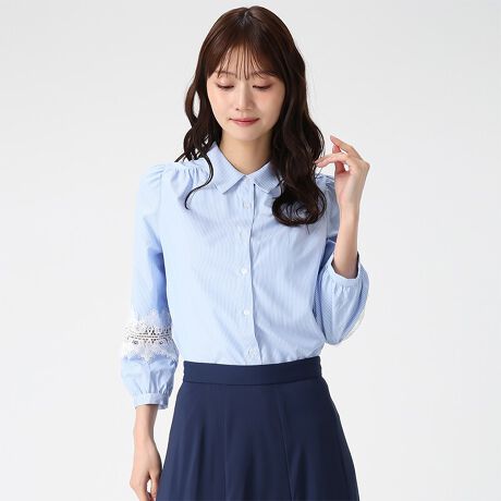レース切替が上品なアクセントになる、きれいめな印象のシャツブラウス。袖部分にレースを切り替えることで、シンプルな中にさりげない華やかさを添えています。スカートできれいめに、パンツ合わせで大人カジュアルにも着回せます。■fabric透け感[無し]裏地[無し]伸縮性[無し]生地の厚さ[薄手]