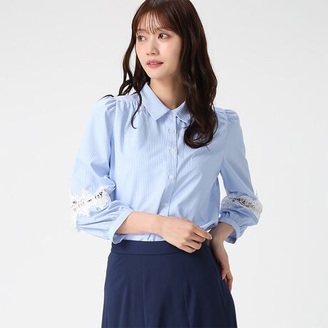 レース切替が上品なアクセントになる、きれいめな印象のシャツブラウス。袖部分にレースを切り替えることで、シンプルな中にさりげない華やかさを添えています。スカートできれいめに、パンツ合わせで大人カジュアルにも着回せます。■fabric透け感[無し]裏地[無し]伸縮性[無し]生地の厚さ[薄手]